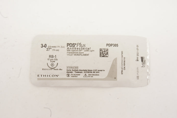 - Ethicon PDP305 3-0 PDS Plus, RB-1, 17mm 1/2c Taper, 27inch
