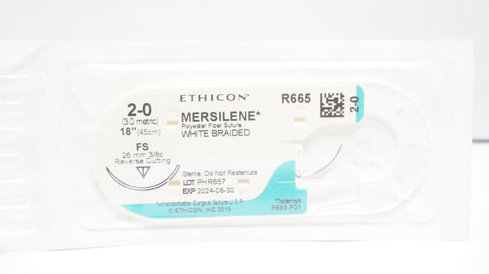 - Ethicon R665 2-0 Mersilene Polyester FS 26mm 3/8c Reverse Cutting 18inch (x)