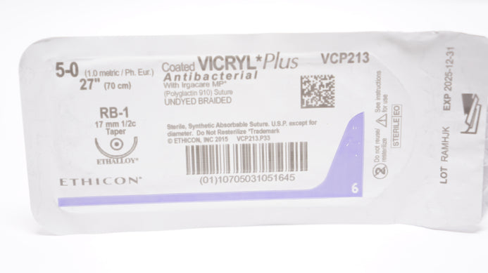 - Ethicon VCP213 5-0 VICRYL Plus, RB-1 17mm 1/2c Taper, 27inch (x)