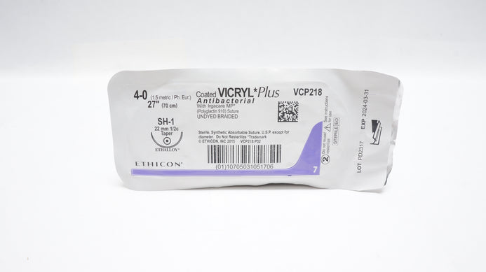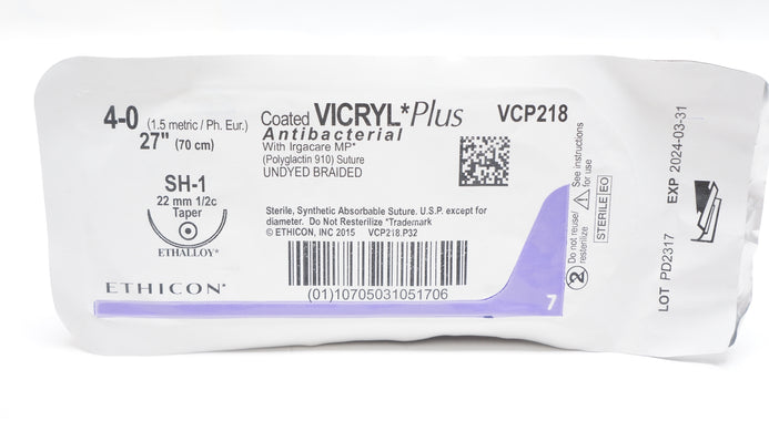 - Ethicon VCP218 4-0 VICRYL Plus, SH-1 22m 1/2c Taper, Undyed Braided, 27in. (x)