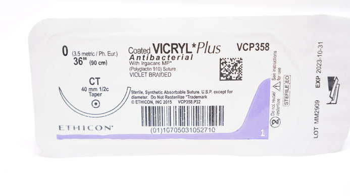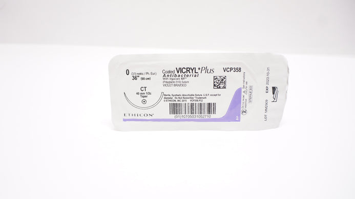 - Ethicon VCP358 0 Coated Vicryl Plus, CT, 40mm 1/2c Taper, 36inch (x)