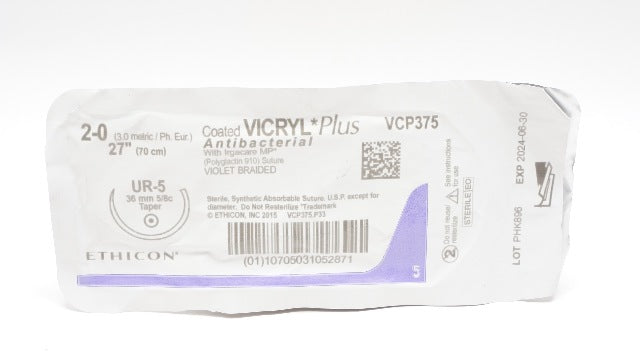- Ethicon VCP375 VICRYL Plus Antibacterial Stre UR-5 36mm 5/8c Taper 27inch (x)