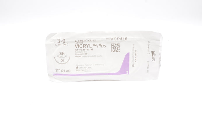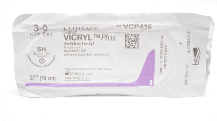 - Ethicon VCP416 3-0 Vicryl Plus, SH, 26mm 1/2c Taper, 27inch