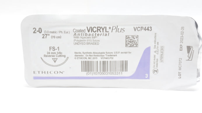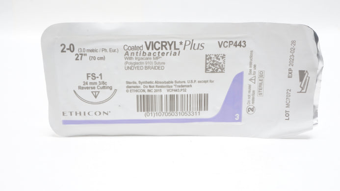 - Ethicon VCP443 2-0 VICRYL Plus Stre, FS-1 24mm 3/8c Reverse Cutting 27inch (x)