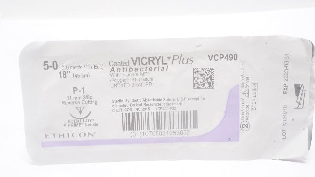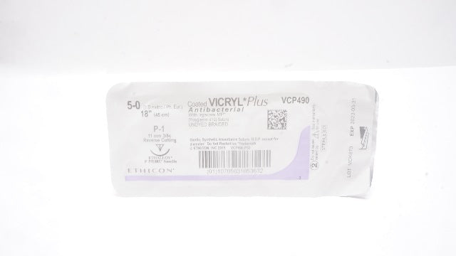 - Ethicon VCP490 5-0 VICRYL Plus P-1 11mm 3/8c Reverse Cutting 18inch (x)