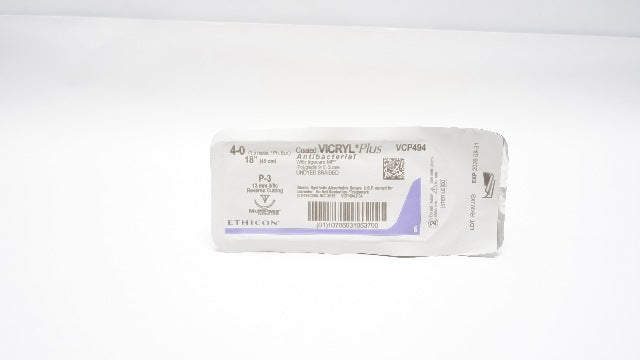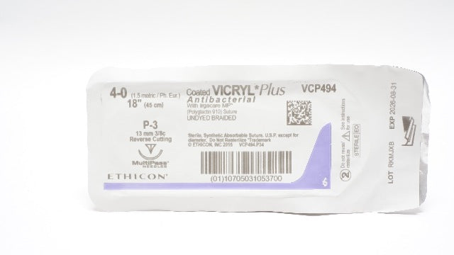 - Ethicon VCP494 4-0 Vicryl Polyglactin Stre P-3 13mm 3/8c Reverse Cutting, 18inch