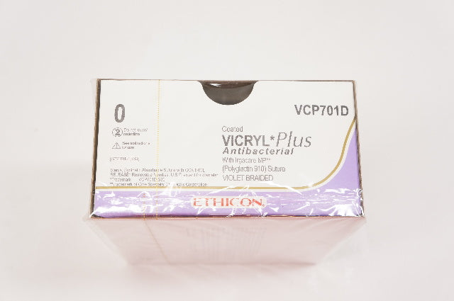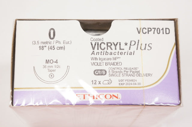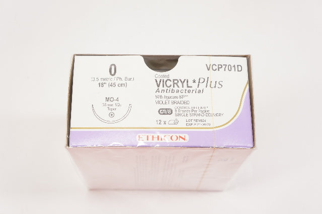 - Ethicon VCP701D 0 VICRYL Plus, MO-4, 36mm 1/2c Taper, 18inch - Box of 12
