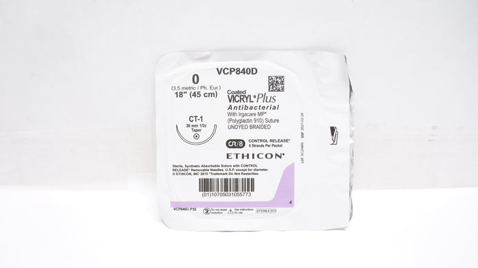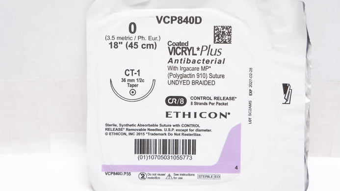 - Ethicon VCP840D 0 Coated Vicryl Plus Stre CT-1 36mm 1/2c Taper, 18inch