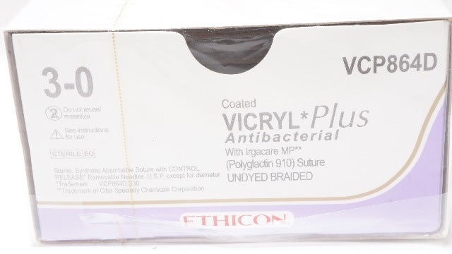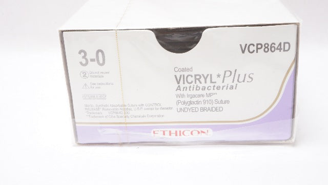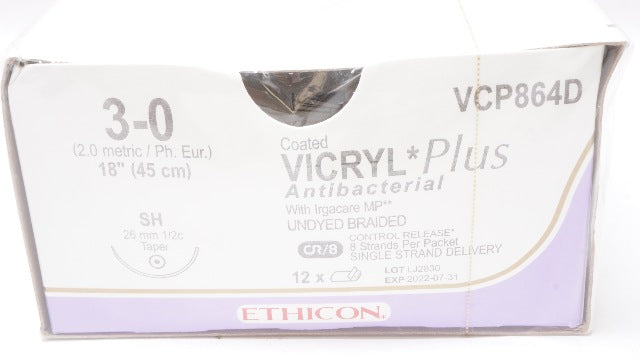 - Ethicon VCP864D 3-0 Coated Vicryl Plus Stre SH 26mm 1/2cTaper 18In-Box of 12 (x)