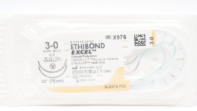 Ethicon X976 Ethibond Excel Green Braided Nonabsorbable Surgical Polyester Suture 3-0, 30in, V-7 26mm 1/2c Tapercut