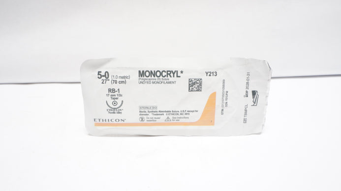 - Ethicon Y213 5-0 Monocryl Undyed Monofilament, RB-1, 17mm 1/2c Taper, 27inch