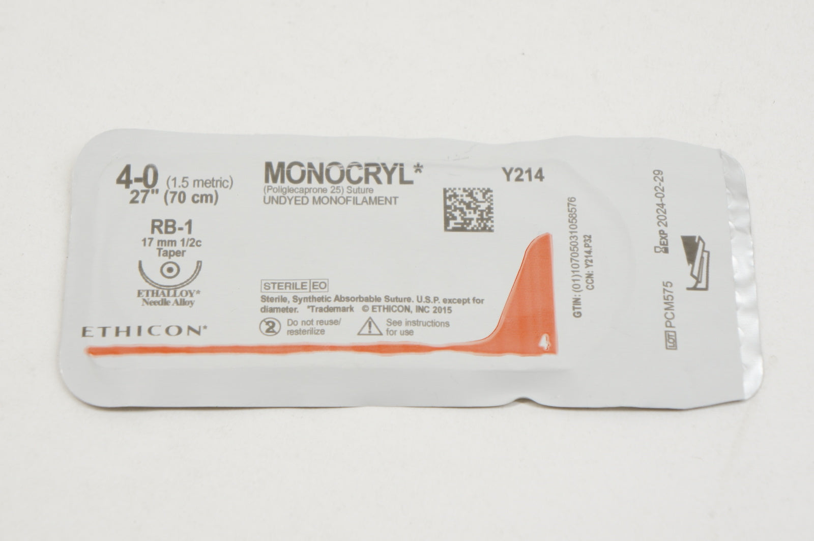 - Ethicon Y214 4-0 MONOCRYL Stre RB-1 17mm 1/2c Taper, 27inch (x)