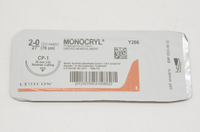 - Ethicon Y266 2-0 MONOCRYL, CP-1, 36mm 1/2c, 27inch