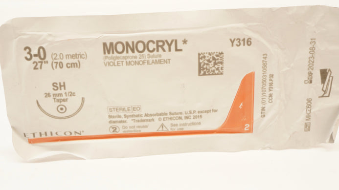 - Ethicon Y316 3-0 MONOCRYL, Violet Monofilament, SH, 26mm 1/2c Taper, 27inch