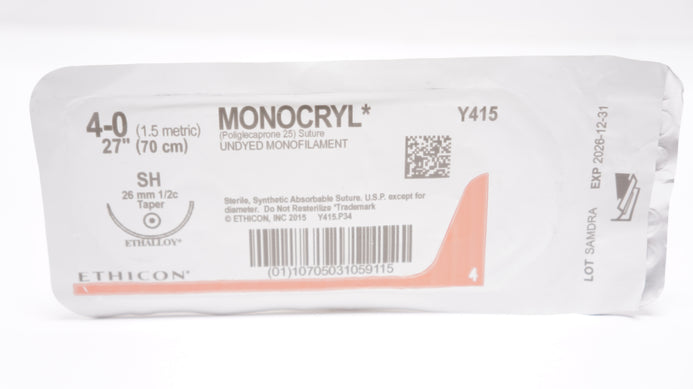- Ethicon Y415 4-0 MONOCRYL, SH, 26mm 1/2c Taper, 27inch