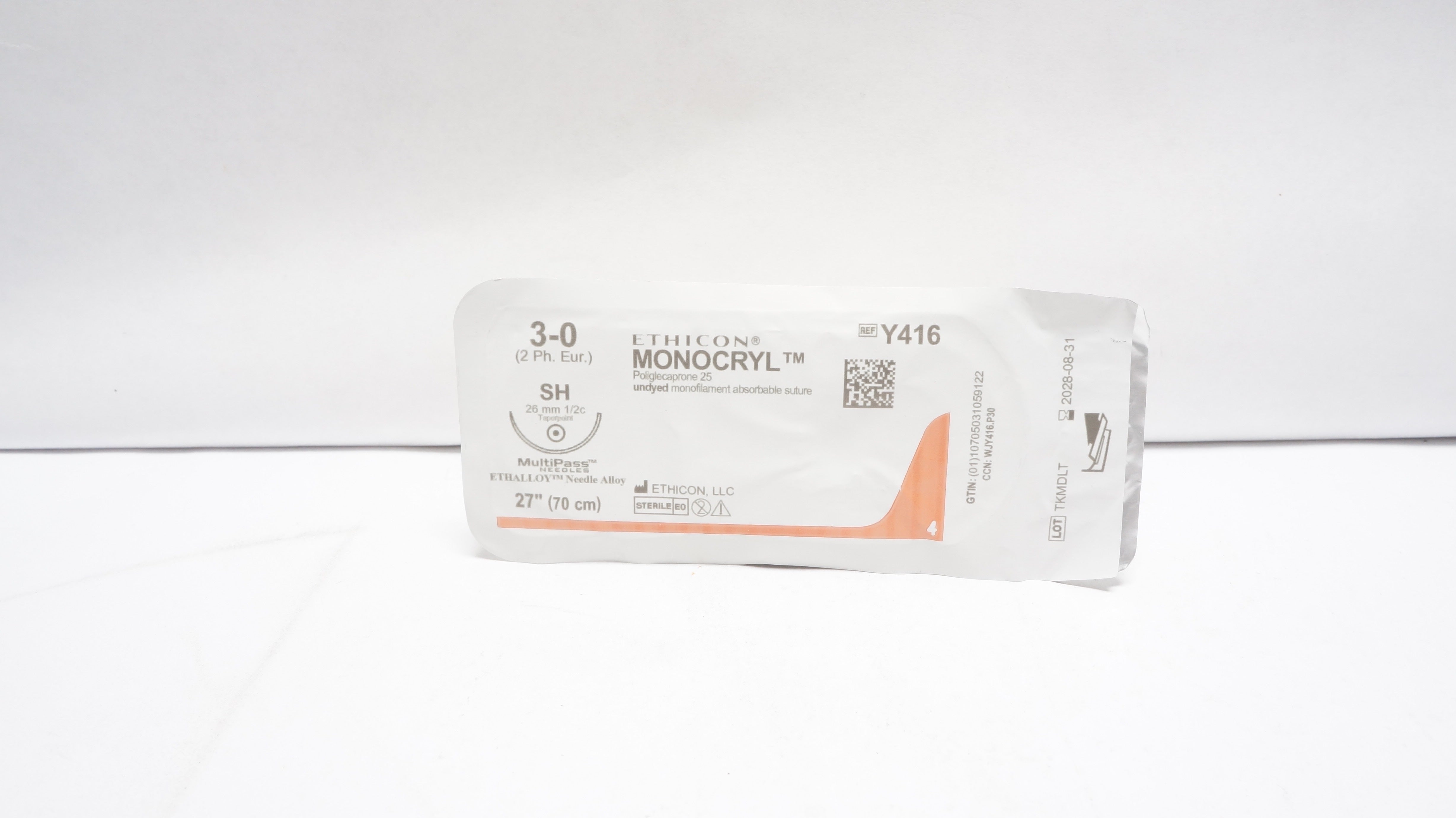 - Ethicon Y416 3-0 Monocryl Undyed Monofilament SH 26mm 1/2c Taper 27inch