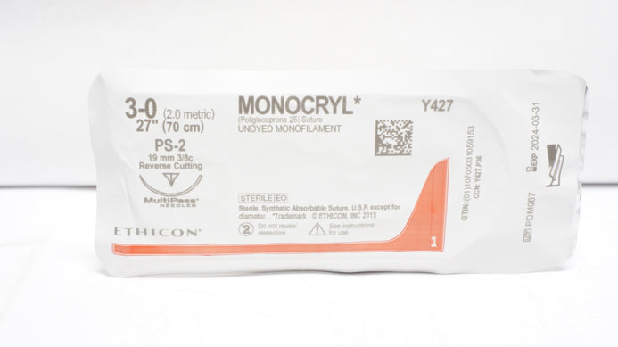 - Ethicon Y427 3-0 Monocryl Stre Undyed PS-2 19mm 3/8c Reverse Cutting, 27inch (x)