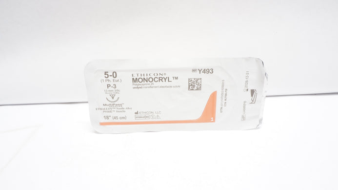- Ethicon Y493 5-0 MONOCRYL Absorbable Stre P-3 13mm 3/8c Reverse Cutting 18inch