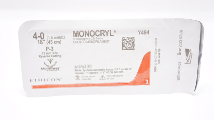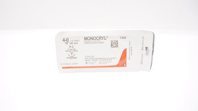 - Ethicon Y494 4-0 MONOCRYL Stre P-3 13mm 3/8c Reverse Cutting 18inch (x)