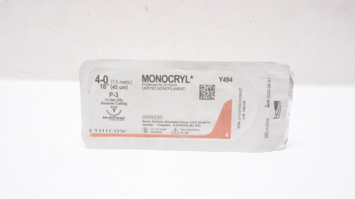 - Ethicon Y494 4-0 MONOCRYL Stre P-3 13mm 3/8c Reverse Cutting 18inch (x)