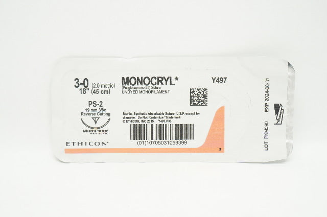 - Ethicon Y497 3-0 MONOCRYL Stre PS-2 19mm 3/8c Reverse Cutting, 18inch