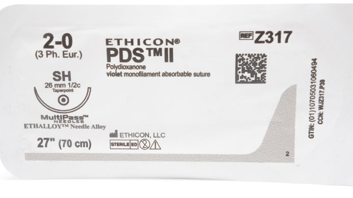 - Ethicon Z317 2-0 PDS II Polydioxanone Stre SH 26mm 1/2c Taperpoint, 27inch (x)