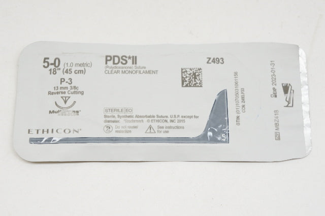 - Ethicon Z493 5-0 PDS II, P-3, 13mm 3/8c Reverse Cutting, 18inch