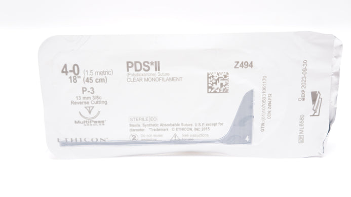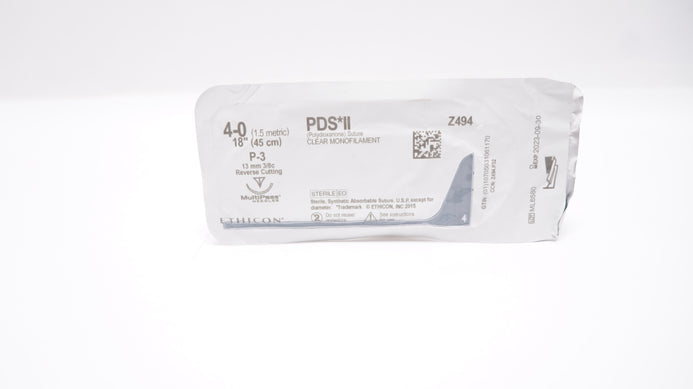 - Ethicon Z494 4-0 PDS II, P-3, 13mm 3/8c Reverse Cutting, 18inch (x)