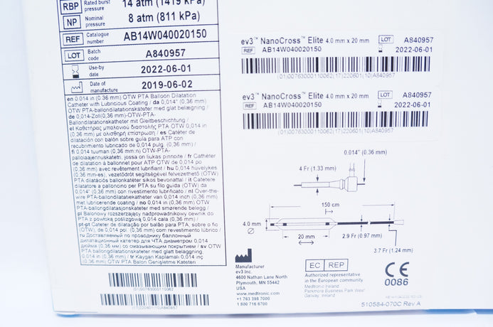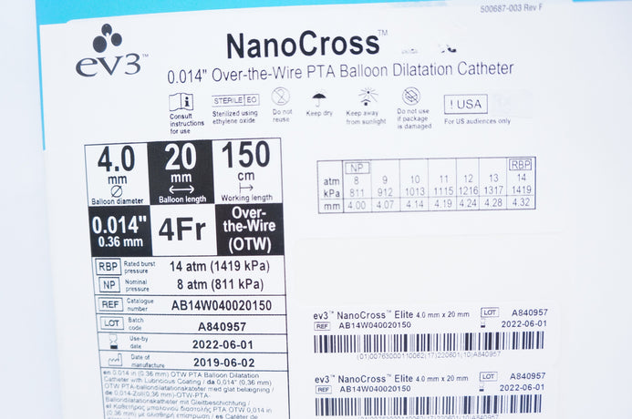 - Ev3 AB14W040020150 0.014inch OTW PTA Balloon Dilatation Cath. 4Fr 4.0mm x 20mm
