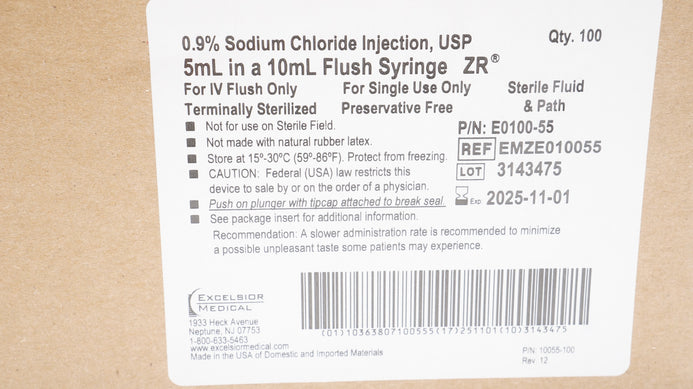 - Excelsior EMZE010055 0.9% Sodium Chloride 5mL in 10mL Flush Syringe - Box of 100