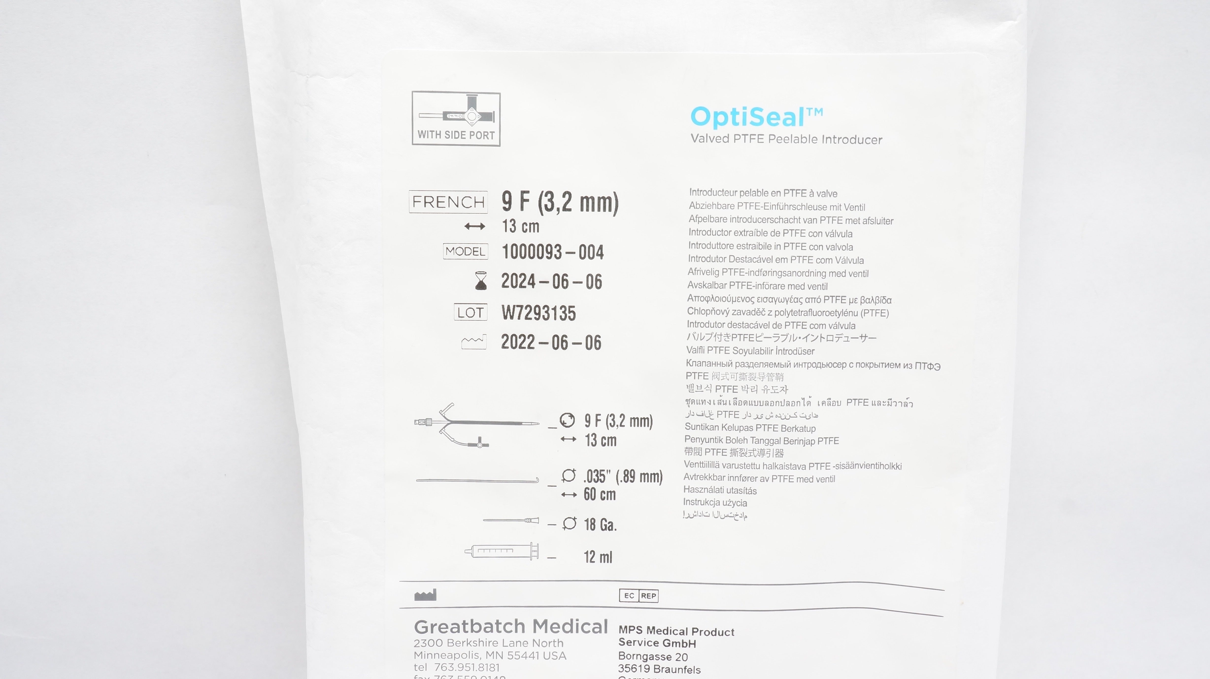 - Greatbatch 1000093-004 OptiSeal Valved PTFE Peelable Introducer 9F x 13cm (x)