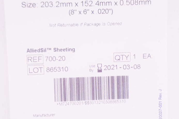 - Implantech 700-20 AlliedSil Sheeting Non-Reinforced 8 x 6 x 020 inch