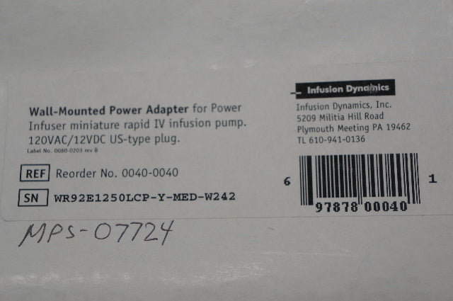 - Infusion Dynamics 0040-0040 120 Volt AC Adapter Power Supply for Power Infuser