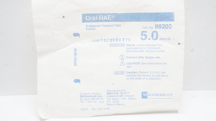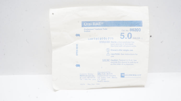 - Mallinckrodt 86200 Oral RAE Tracheal Tube Cuffed 5.0 mm I.D.