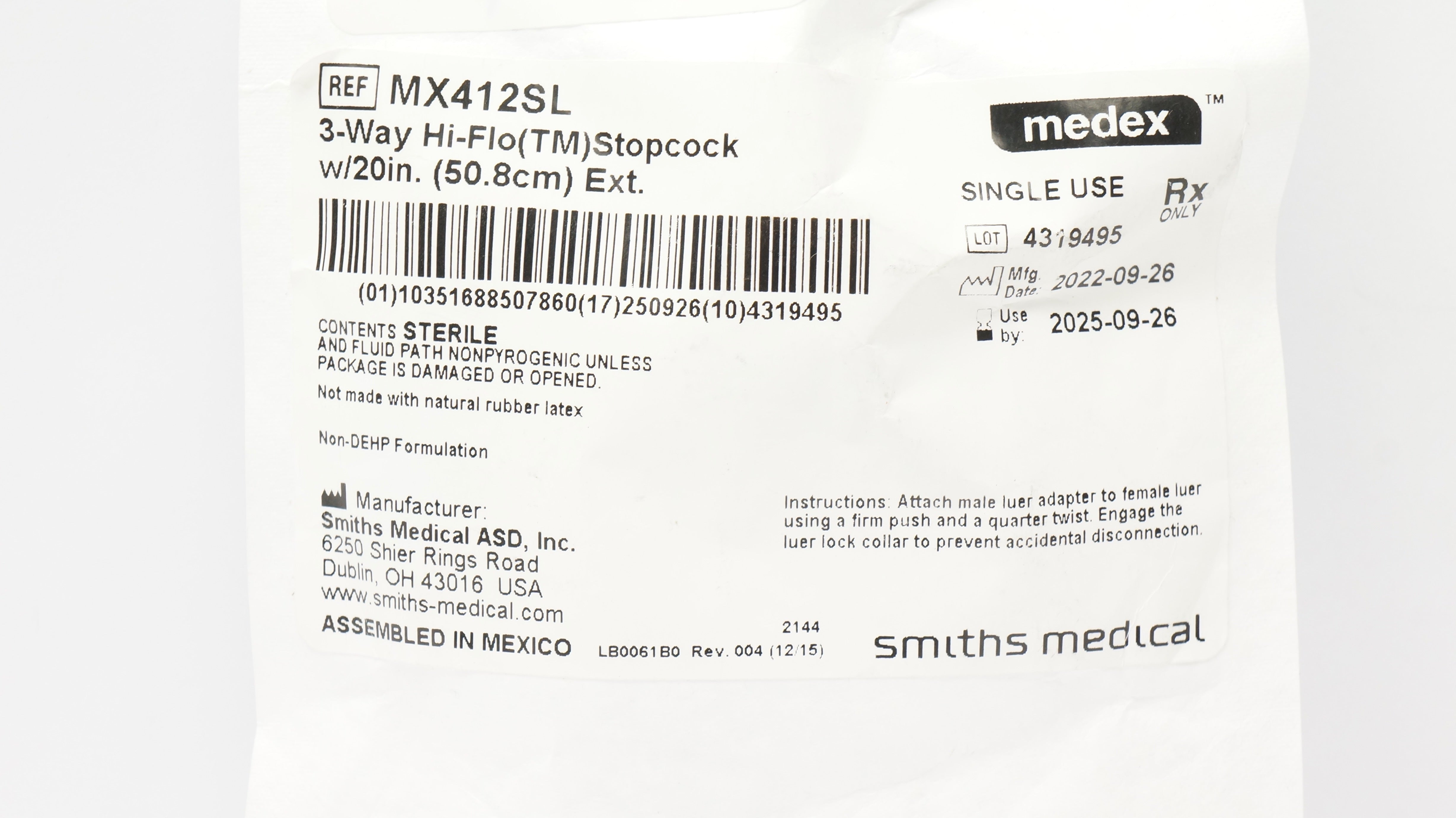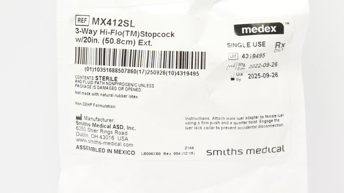 - Medex MX412SL 3-Way Hi-Flo Stopcock w/20in Ext.