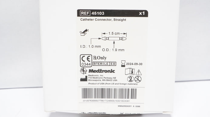 - Medtronic 45103 Catheter Connector, Straight, 1.5cm x 1.0mm ID x 1.9mm OD (x)