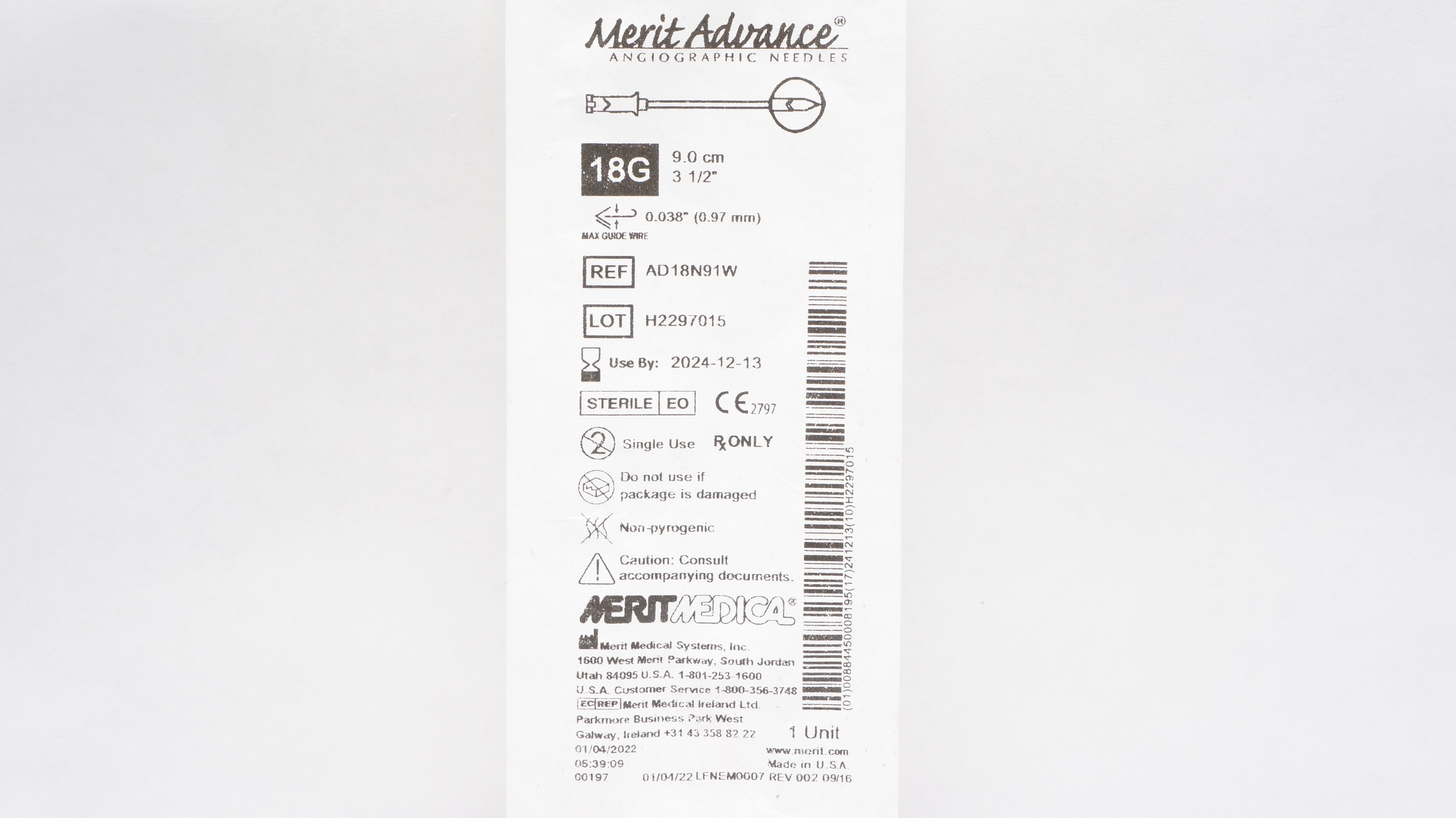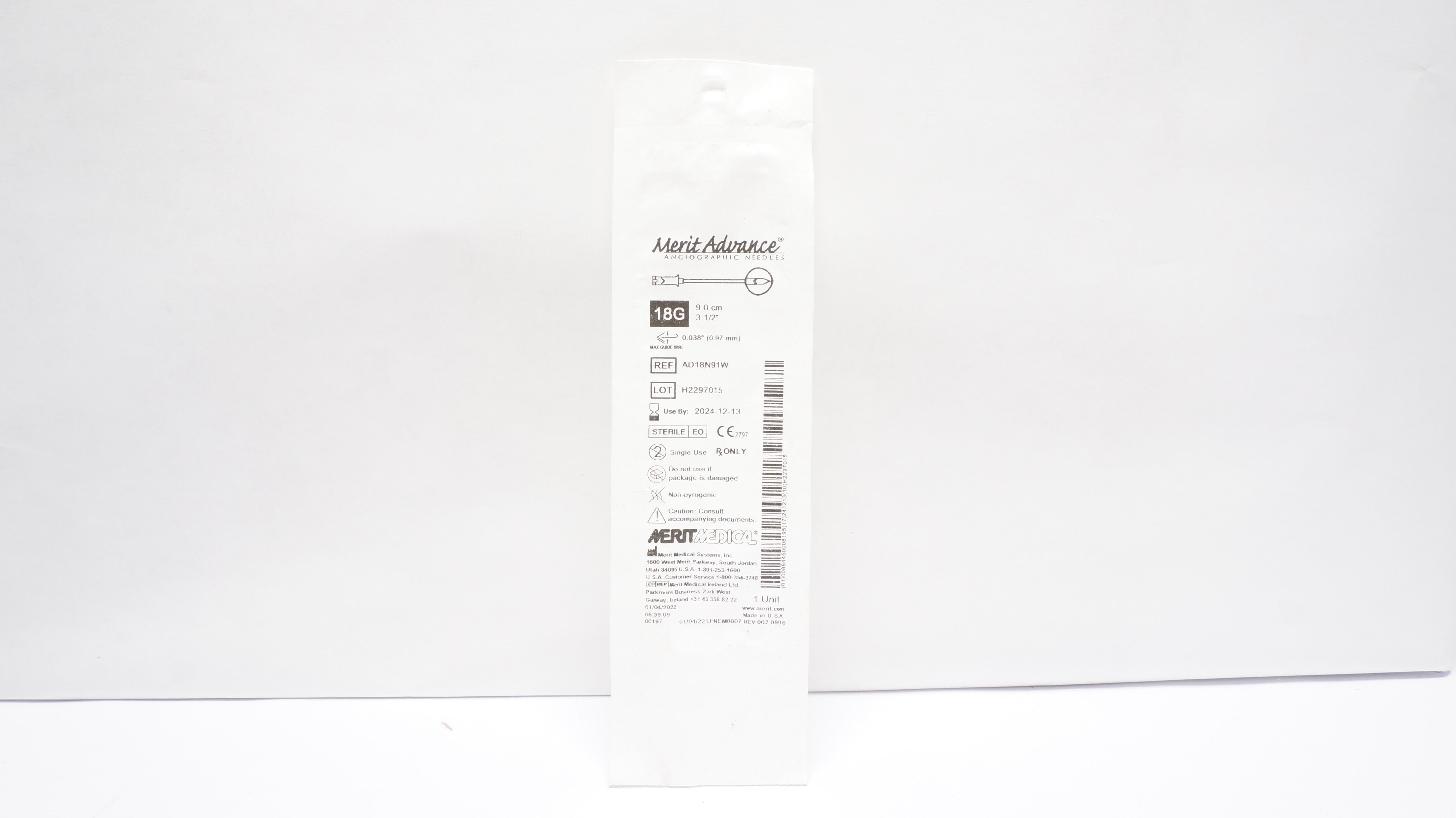- Merit Medical AD18N91W Angiographic Ndle Advance Without Safety 18G 3-1/2in (x)