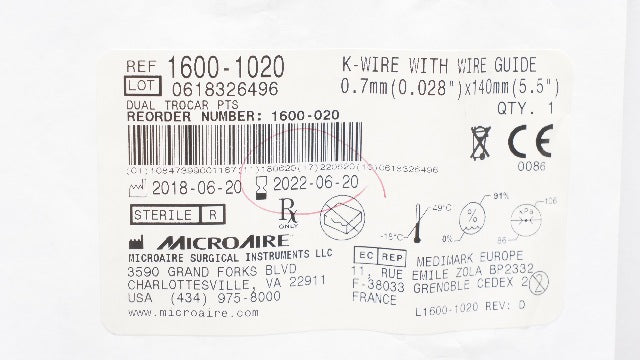 - Microaire 1600-1020 K-Wire w/Wire Guide 0.028inch x 5.5inch (x)