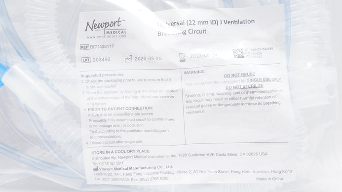 - Newport Medical BCD43811P Universal J Ventilation Breathing Circuit ID 22mm (x)