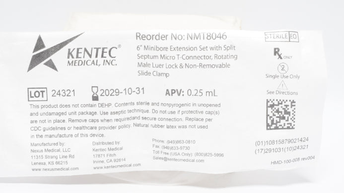 - Nexus Medical NMT8046 Kentec Minibore Extension Set 6inch, APV: 0.25mL