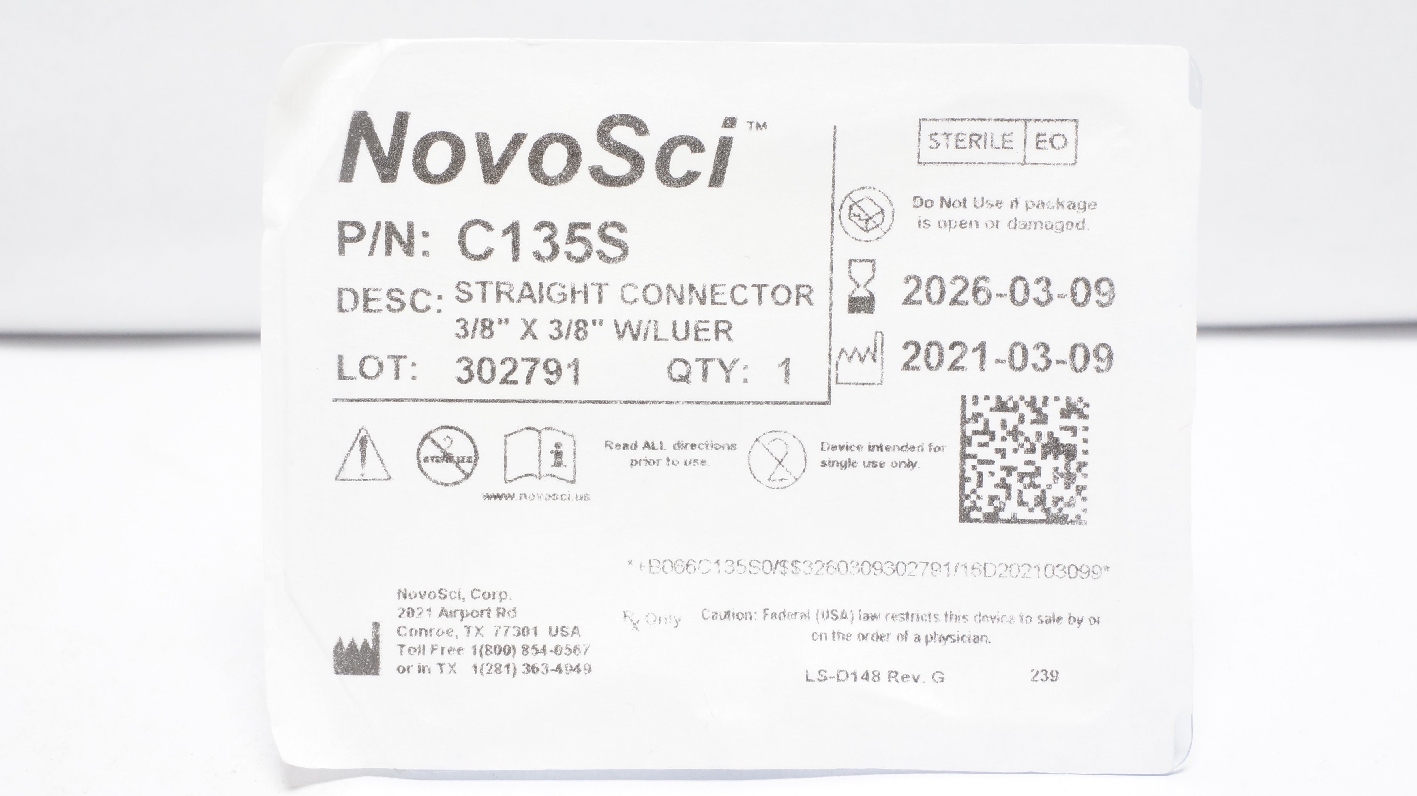 - NovoSci C135S Straight Connector W/Luer 3/8 inch x 3/8 inch