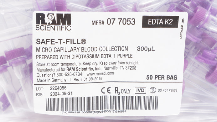 - RAM Scientific 07 7053 SAFE-T-FILL EDTA Capillary Collection 300 μL(x)-Bag of 50