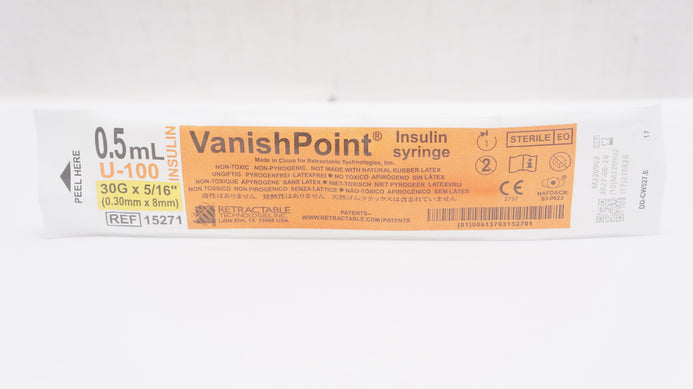 - Retractable 15271 Vanish Point Insulin Syringe U-100 0.5ml 30G x 5/16inch