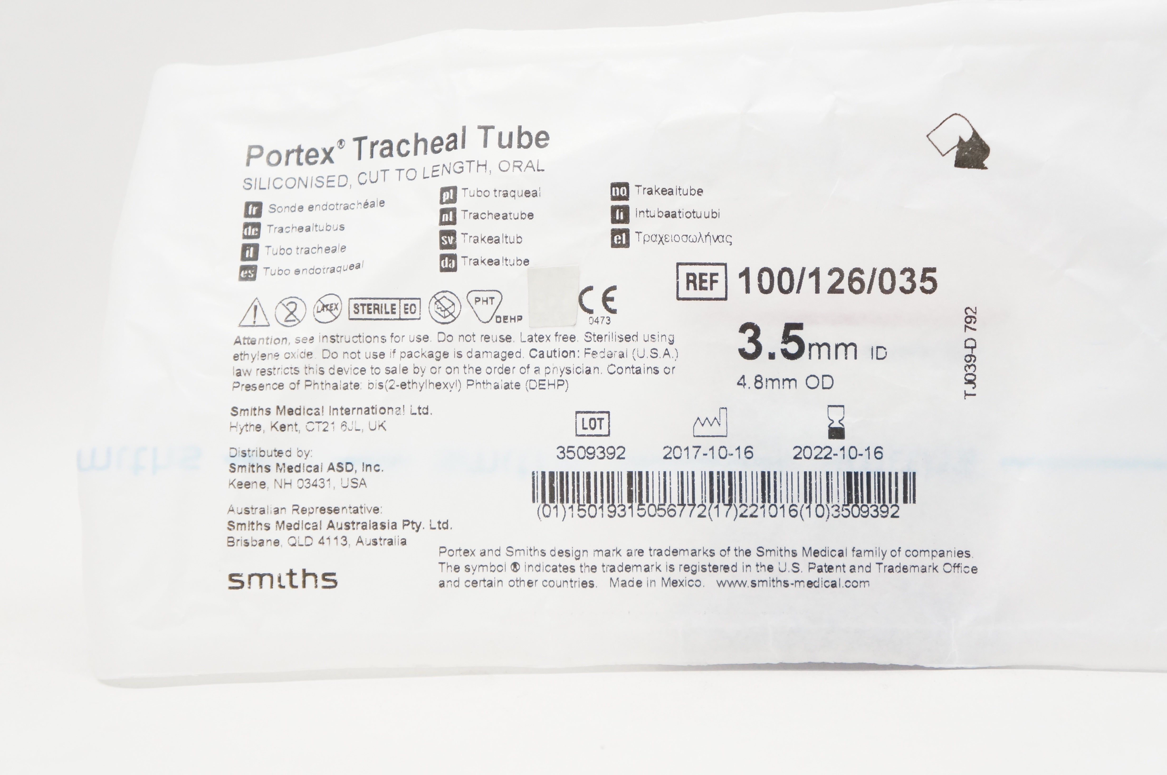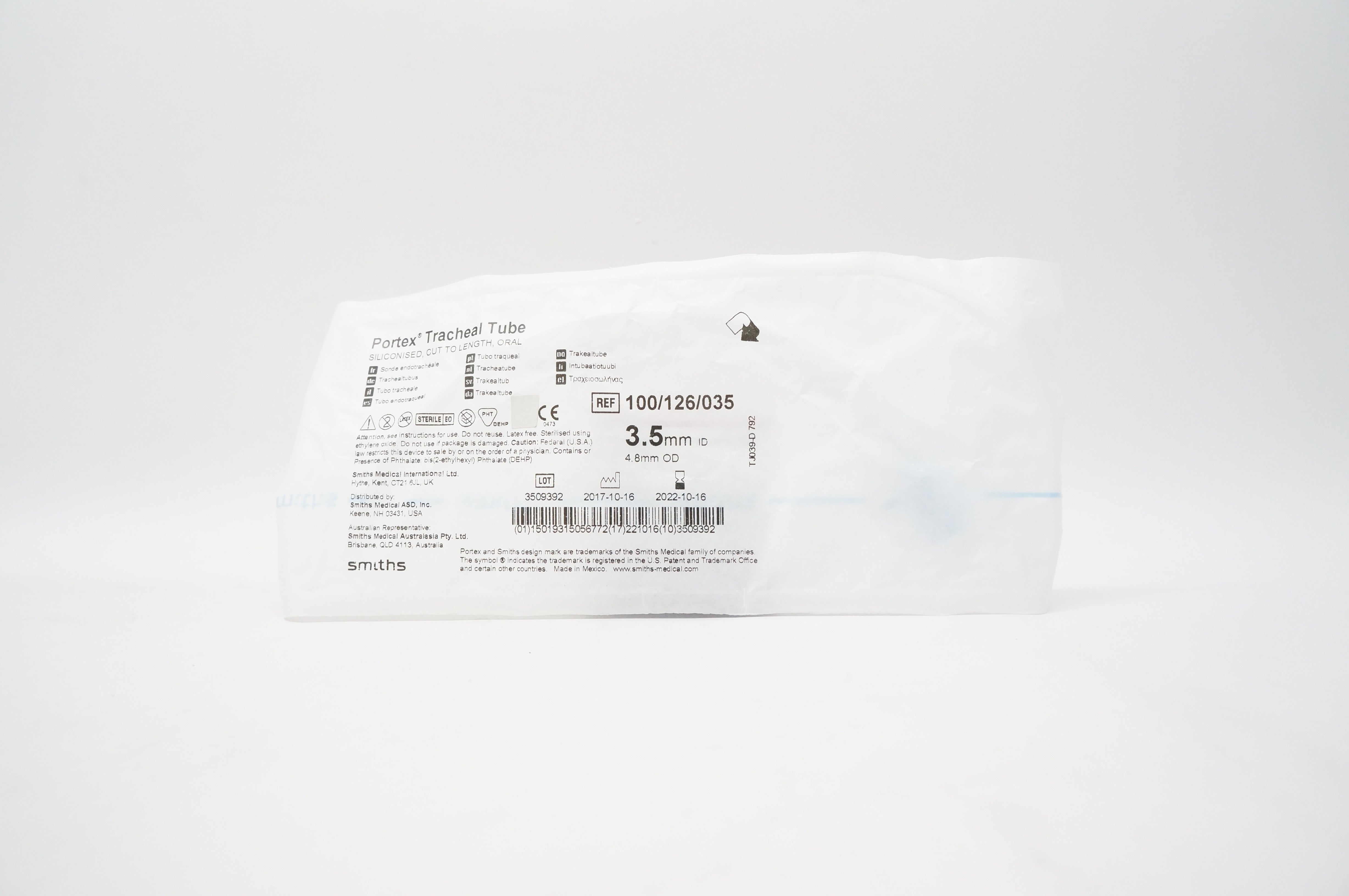 - Smiths Medical 100/126/035 Portex Tracheal Tube 3.5mm x 4.8mm