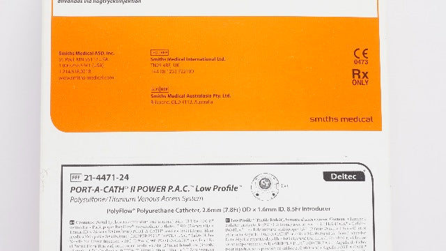 Contents: Portal with Ultra-Lock Connctor, Radiopaque PolyFlow Polyurethane Catheter, 7.8Fr, 20G Port-A-Cath Needle, 16G Blunt Needle, Vein Pick, 20G Gripper Plus Power P.A.C. Safety Huber Needle for Power Injection, 20G 90 Degree Port-A-Cath Needle 18G Extra Thin Wall Introducer Needle, 8.5Fr Introducer, 2 "J" Guidewires 0.035 inch, 50cm, 70cm, 2 Syringes, Tunneling Tool, 3 Point-Lok Sharps Safety Devices