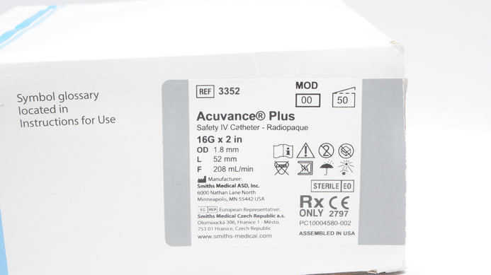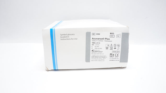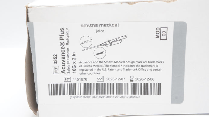 - Smiths Medical 3352 Jelco Acuvance Plus Safety IV Cath. 16G x 2inch - Box of 50