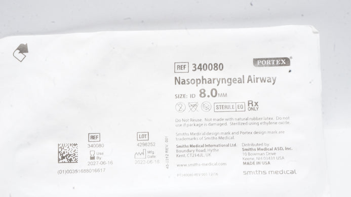 - Smiths Medical 340080 Portex Nasopharyngeal Airway, Size: ID 8.0mm