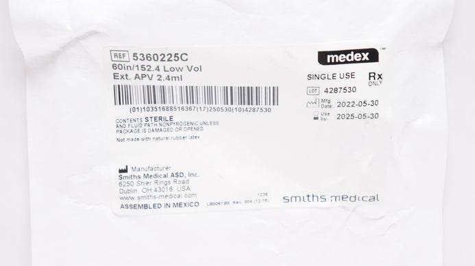 - Smiths Medical 5360225C Medex Extension Set Low-Vol 60 Inch Tubing 2.4 mL