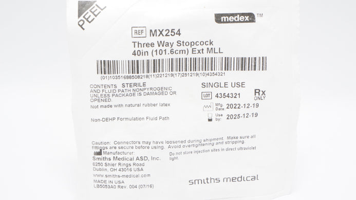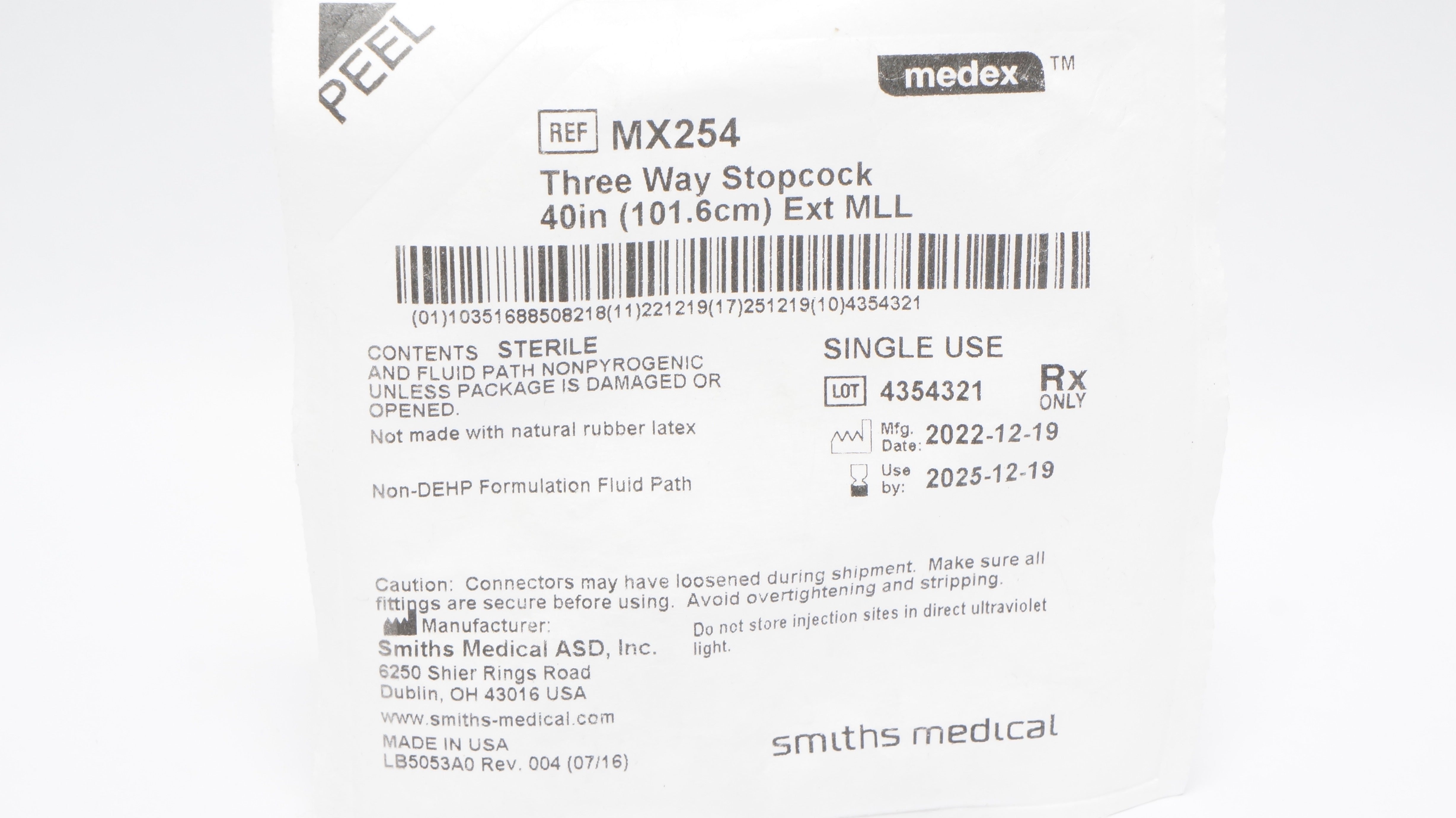 - Smiths Medical MX254 Medex Three Way Stopcock 40inch Ext MLL