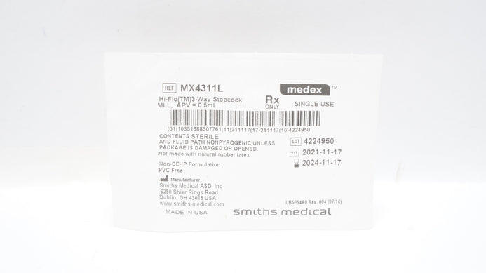 - Smiths Medical MX4311L Hi-Flo 3 Way Stopcock MLL, APV 0.5ml Sterile